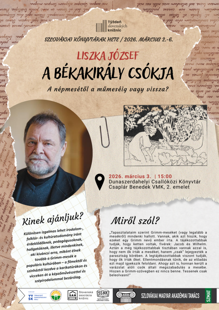 Liszka József, a SzMAT tagja előadást tart a Dunaszerdahelyi Csallóközi Könyvtár és a SzMAT közös rendezvényén 2026. március 3-án 15:00 órától. Előadásának címe: A békakirály csókja – A népmesétől a műmeséig vagy vissza?