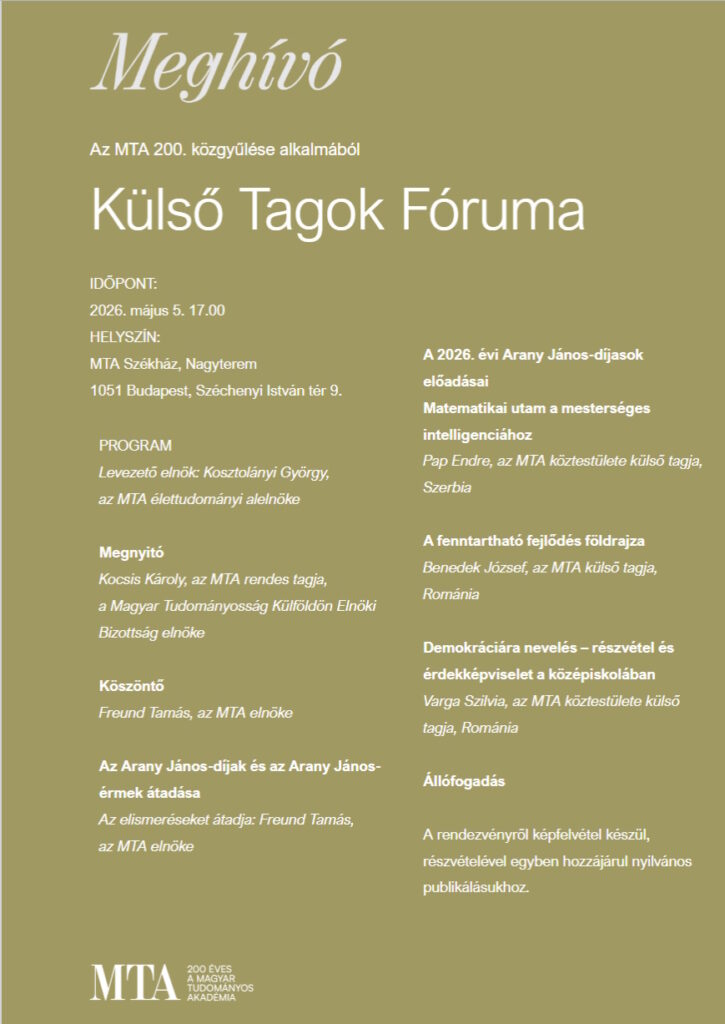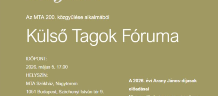 Az MTA 200. közgyűléséhez kapcsolódva 2026. május 5-én 17 órától kerül sor a Külső Tagok Fórumára a Magyar Tudományos Akadémia székházának nagytermében. A rendezvényt Kosztolányi György, az MTA élettudományi alelnöke vezeti, a megnyitót Kocsis Károly, az MTK EB elnöke tartja, míg a résztvevőket Freund Tamás, az Akadémia elnöke köszönti. Az esemény kiemelt része az Arany János-díjak és -érmek átadása, amelyeket szintén az MTA elnöke ad át. A programban a 2026. évi díjazottak előadásai is szerepelnek…